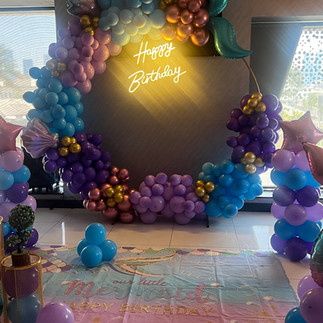 The birthday party decorations feature vibrant colours, glittering balloons, and shimmering streamers. Festive banners, bunting, and themed tableware add a magical touch, with personalized details making it an unforgettable celebration.